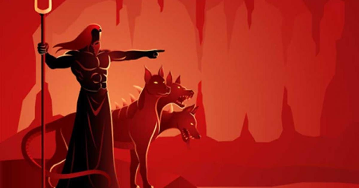 HADES, god of the dead, was king of the underworld. He holds a bident [two-pronged pitchfork] with Cerberus, the three-headed guard-dog, standing at his side. His spouse was Persephone.